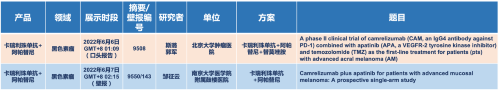 在黑色素瘤领域,AG亚游集团医药的卡瑞利珠单抗联合阿帕替尼(“双艾”组合)在2022 ASCO共入选1项口头报告和1项壁报展示。